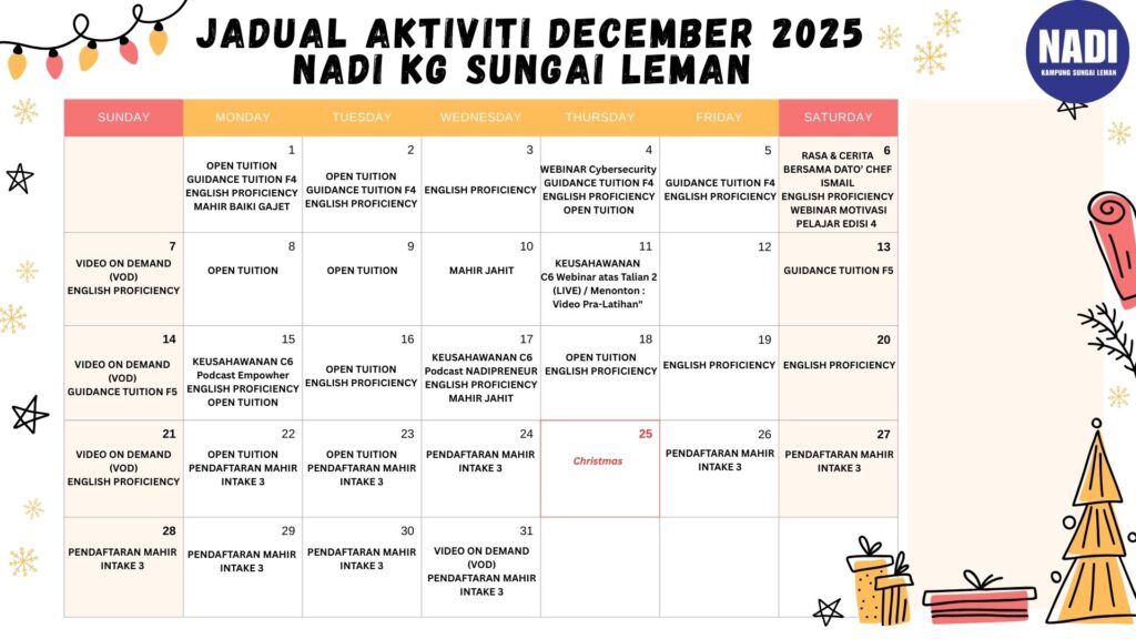 Berikut merupakan jadual perancangan aktiviti yang akan dijalankan di NADI Kg Sungai Leman sepanjang bulan December 2025.