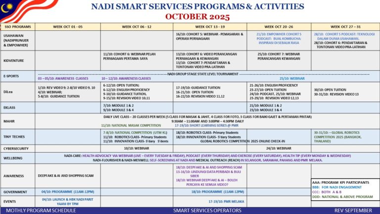 JADUAL MINGGU 1 | OKTOBER 2025 Bulan Oktober bermula dengan pelbagai aktiviti menarik di NADI! DILEA (Video on Demand & Webinar) WELLBEING (Kesihatan, Podcast, Screening) E-SPORT (NADI Group Stage State Level Tournament) Awareness OSS Jom sama-sama sertai program bermanfaat ini. […]
