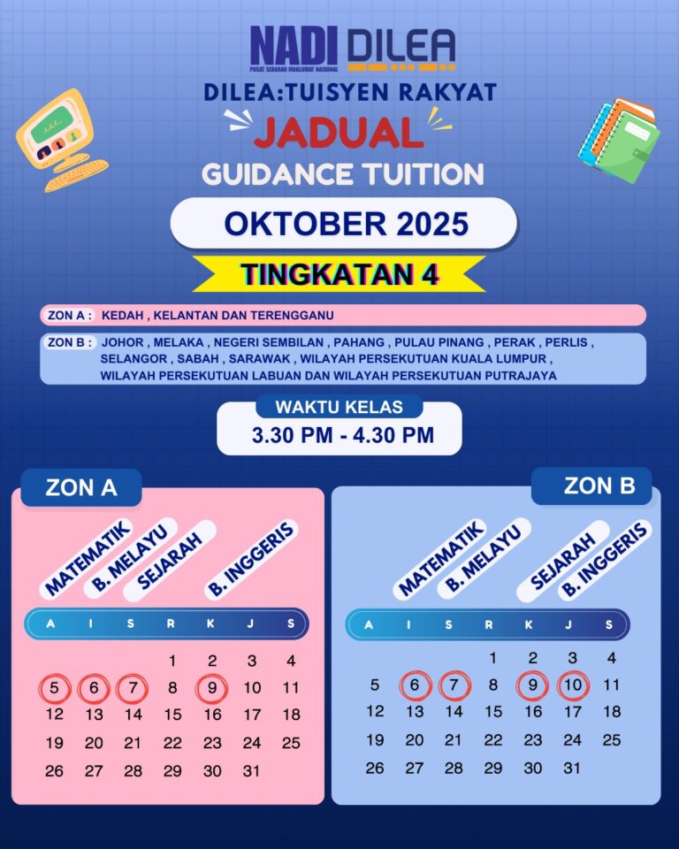 🎉📚 Program DILEA: Tuisyen Rakyat – Oktober 2025 📚🎉 Assalamualaikum & Salam Sejahtera! 🌟✨ DILEA kembali dengan sesi pembelajaran seru & bermanfaat sepanjang bulan Oktober! 😎💡 1️⃣ Guidance Tuition 👩🏫👨🏫 Tingkatan 4: Isnin, Rabu & Khamis 🗓️ (ikut zon) Tingkatan […]