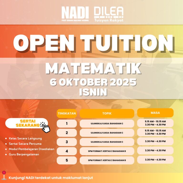 🔥 JANGAN LUPA KELAS OPEN TUITION MATEMATIK!🔥 Untuk semua pelajar Tingkatan 1 hingga 5!Rasa Matematik tu susah? Nak cara belajar yang lebih fun & senang faham? 🤔 Jom sertai Open Tuition bersama NADI DILEA: Tuisyen Rakyat! 🚀 📚 Subjek: Matematik🗓 […]