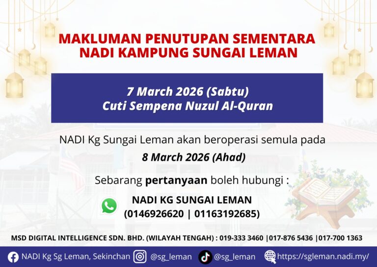 Dimaklumkan bahawa NADI Kampung Sungai Leman akan ditutup sementara pada 7 March 2026 (Sabtu) sempena Cuti Nuzul Al-Quran.NADI Kg Sungai Leman akan beroperasi semula pada 8 March 2026 (Ahad). Sebarang pertanyaan, sila hubungi NADI Kampung Sungai Leman : 014-692 6620 […]