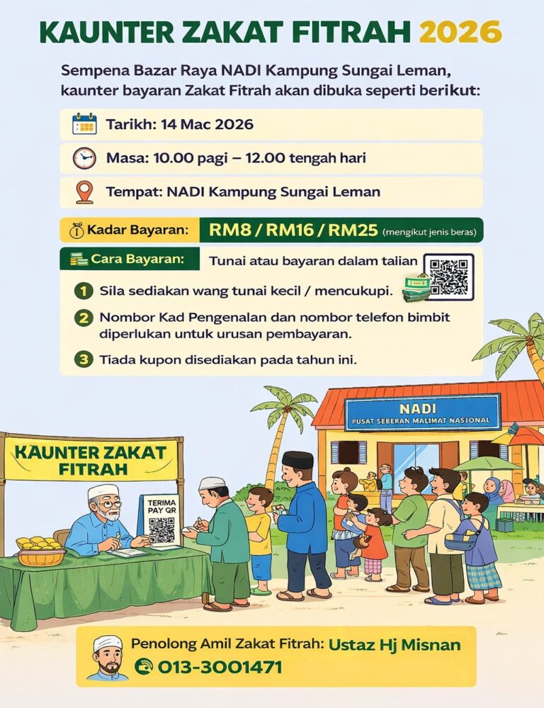 π’ HEBAHAN KAUNTER ZAKAT FITRAH 2026 Kaunter bayaran Zakat Fitrah akan dibuka sempena Bazar Raya NADI Kampung Sungai Leman. π Tarikh: 14 Mac 2026β° Masa: 10.00 pagi β 12.00 tengah hariπ Tempat: NADI Kampung Sungai Leman π° Kadar Bayaran: RM8 […]