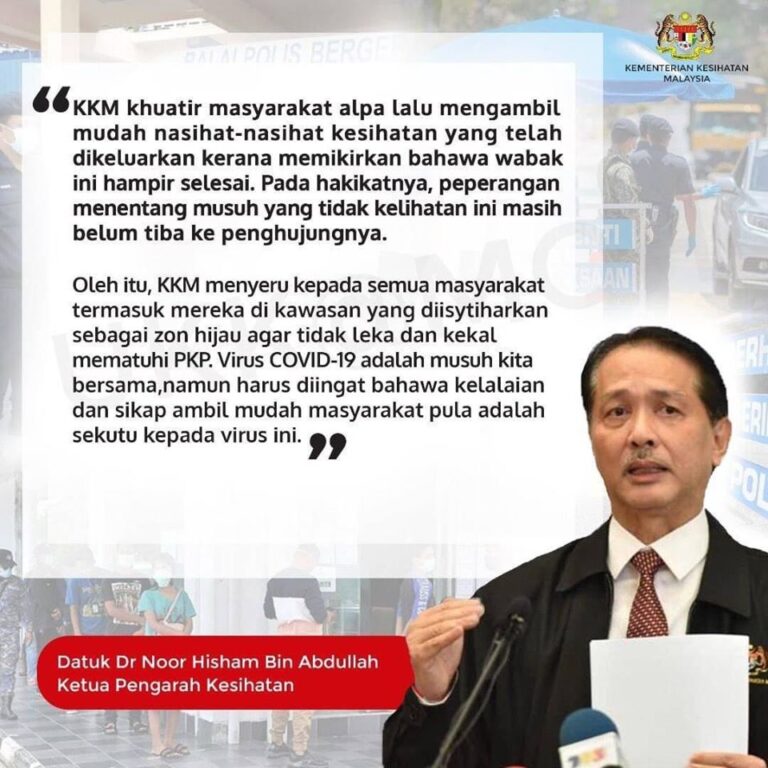 Ketua Pengarah Kesihatan Datuk Dr Noor Hisham Abdullah berkata, KKM khuatir masyarakat mengambil mudah nasihat kesihatan yang telah dikeluarkan kerana memikirkan bahawa wabak itu hampir selesai. “Pada hakikatnya, peperangan menentang musuh yang tidak kelihatan ini masih belum tiba ke penghujungnya,” […]