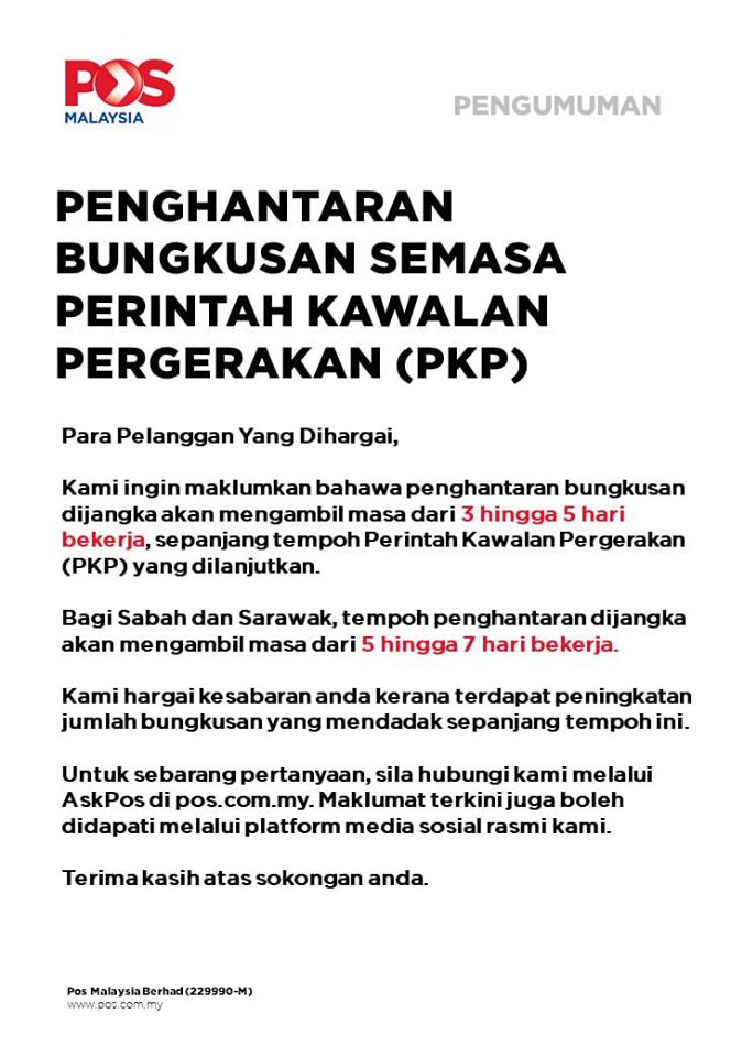 MAKLUMAN PENTING Para Pelanggan Yang Dihargai, Sila rujuk kepada pengumuman di bawah untuk jangkaan masa penghantaran bungkusan sepanjang tempoh Perintah Kawalan Pergerakan yang dilanjutkan. Terima kasih. #PKP #COVID19#stayathome#dudukdirumah