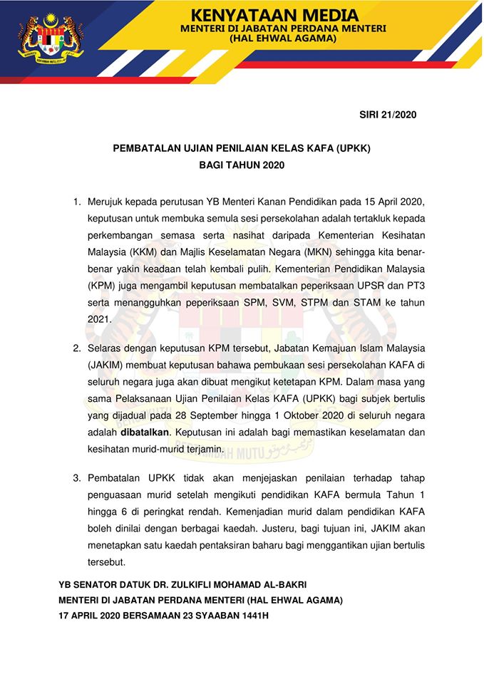 KENYATAAN MEDIA MENTERI DI JPM (HAL EHWAL AGAMA) PEMBATALAN UJIAN PENILAIAN KELAS KAFA (UPKK) BAGI TAHUN 2020 Merujuk kepada perutusan YB Menteri Kanan Pendidikan pada 15 April 2020, keputusan untuk membuka semula sesi persekolahan adalah tertakluk kepada perkembangan semasa serta […]