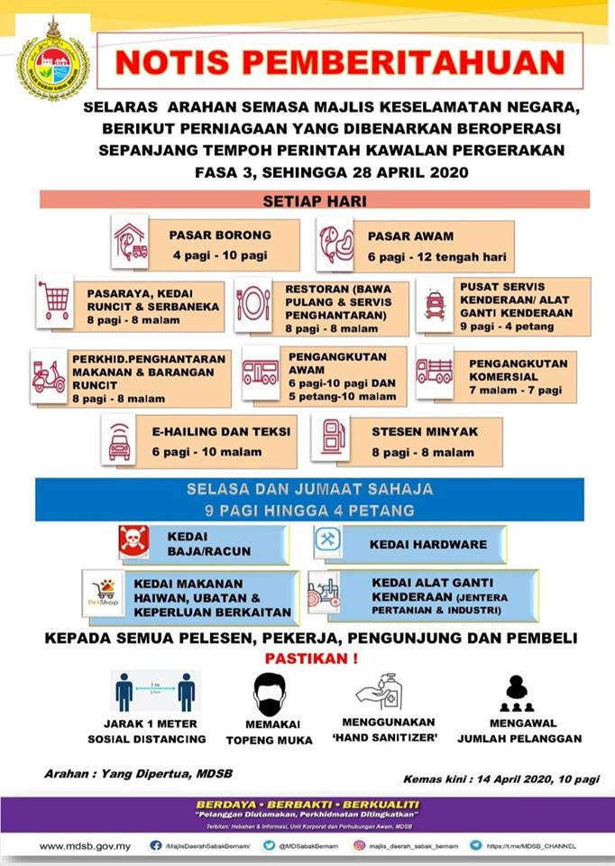 PERNIAGAAN/ PERKHIDMATAN YANG DIBENARKAN BEROPERASI SEPANJANG TEMPOH PERINTAH KAWALAN PERGERAKAN FASA 3, SEHINGGA 28 APRIL 2020 #COVID19#stayathome#dudukdirumah