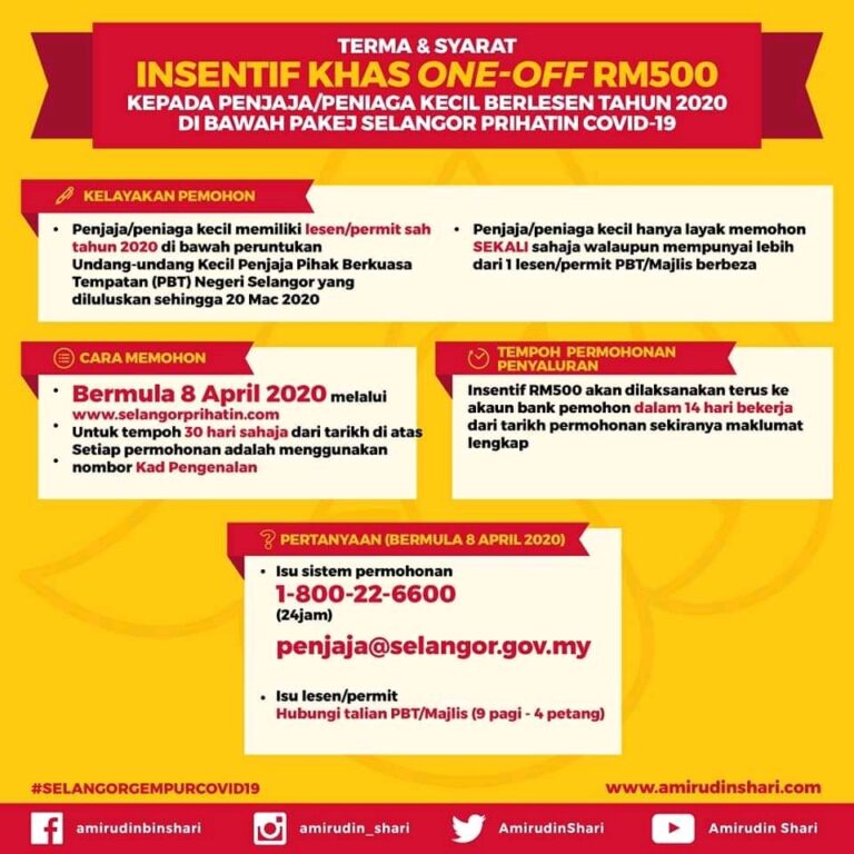 Insentif Khas One-off RM 500 kepada penjaja/peniaga kecil berlesen di bawah pakej Selangor Prihatin Covid-19. Permohonan bermula hari Rabu, 8hb April 2020 dan tarikh tutup permohonan adalah 30 hari selepasnya. Untuk pertanyaan dan semakan kelayakan sila hubungi MDSB. Perkhidmatan adalah […]