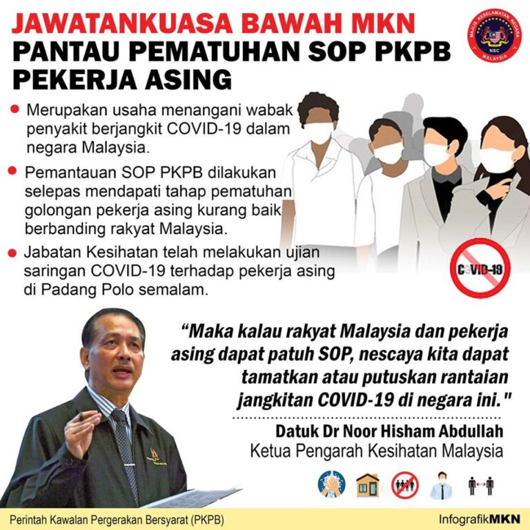 Majlis Keselamatan Negara (MKN) menerusi jawatankuasa sedia ada akan memantau tahap pematuhan prosedur operasi standard (SOP) Perintah Kawalan Pergerakan Bersyarat dalam kalangan pekerja asing sebagai usaha kerajaan memutuskan rantaian jangkitan COVID19 di negara ini. #COVID19#stayathome#dudukdirumah