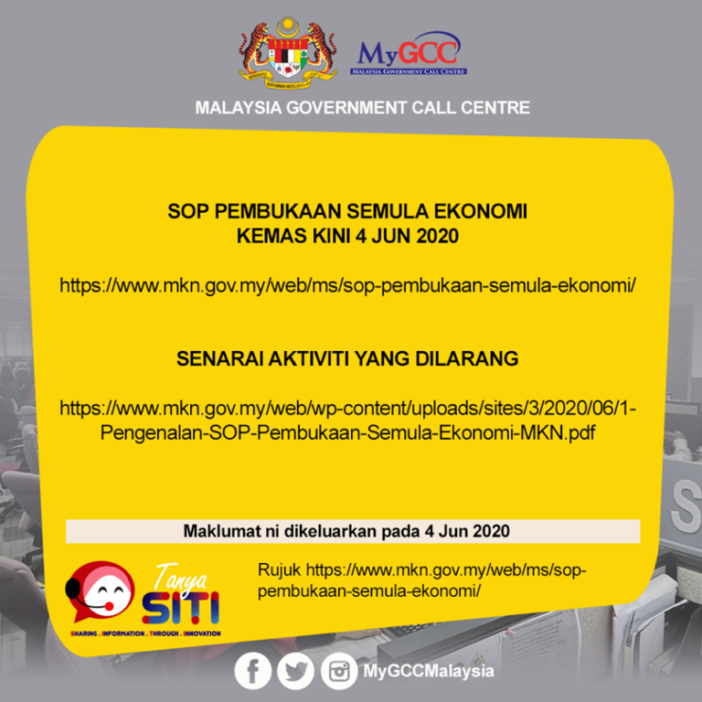 SOP PEMBUKAAN SEMULA EKONOMI KEMAS KINI 4 JUN 2020 Untuk makluman. Anda boleh melihat kepada SOP terbaru yang dikeluarkan oleh MKN. SOP ini dikemas kini pada 4 Jun 2020. https://www.mkn.gov.my/web/ms/sop-pembukaan-semula-ekonomi/ SENARAI AKTIVITI YANG DILARANG Senarai aktiviti yang dilarang. Kemas […]