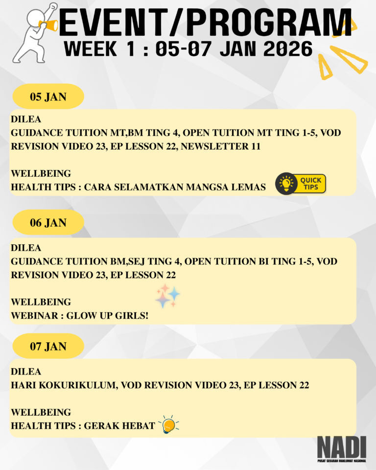 📢 EVENT / PROGRAM NADI 🗓️ JANUARI 2026 | WEEK 1 (05–11 JAN) ✨ Awal tahun dimulakan dengan pelbagai program menarik & bermanfaat untuk semua peringkat umur! 📚 Pendidikan (DiLEA)✔️ Guidance Tuition Tingkatan 1–5✔️ Open Tuition pelbagai subjek✔️ VOD Revision […]