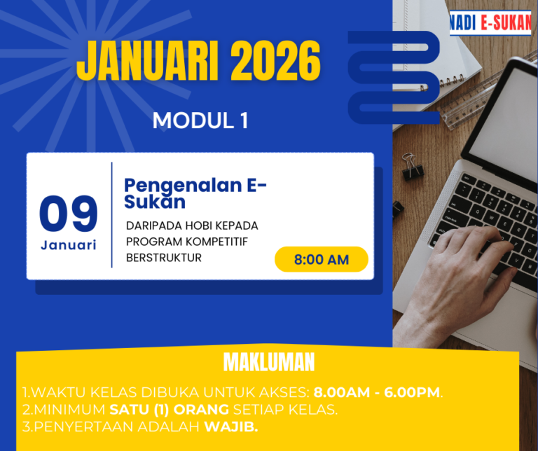 🔥 JOM KENALI DUNIA E-SUKAN! 🔥📅 9 Januari 2026🕗 Akses kelas: 8.00 AM – 6.00 PM E-Sukan bukan sekadar main game.Ia adalah platform kompetitif, berstruktur & berpotensi kerjaya. 🎮 MODUL 1: PENGENALAN E-SUKAN➡️ Dari hobi ke arah program kompetitif➡️ Asas […]