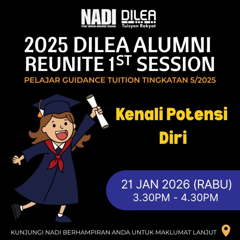 📢 2025 DILEA ALUMNI REUNITE – 1ST SESSION 📢 TAJUK: KENALI POTENSI DIRI Adakah potensi diri anda hanya diukur melalui keputusan SPM?Sesi ini direka khas untuk membantu pelajar mengenali kekuatan sebenar diri, bukan sekadar gred peperiksaan. 🧑🎓 Sasaran:Alumni Guidance Tuition […]