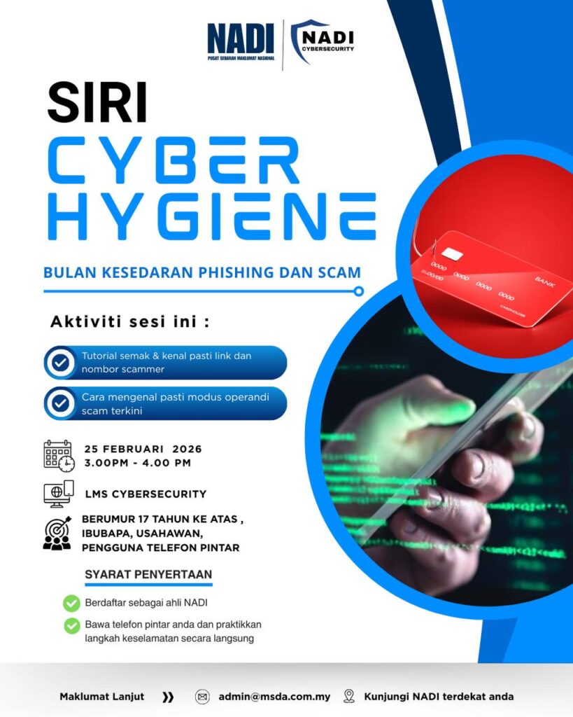 Sukacita dimaklumkan bahawa NADI Cybersecurity akan mengadakan sesi Cyber Hygiene bagi sesi Februari sempena Bulan Kesedaran Phishing dan Scam.