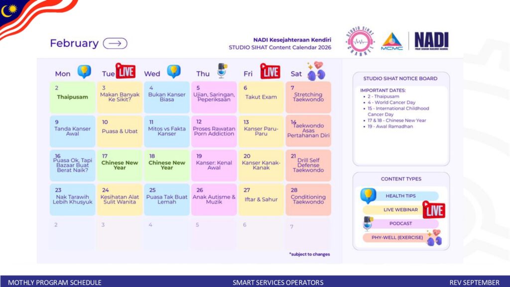 Jadual aktiviti NADI Kesejahteraan Kendiri (Studio Sihat )Februari 2026