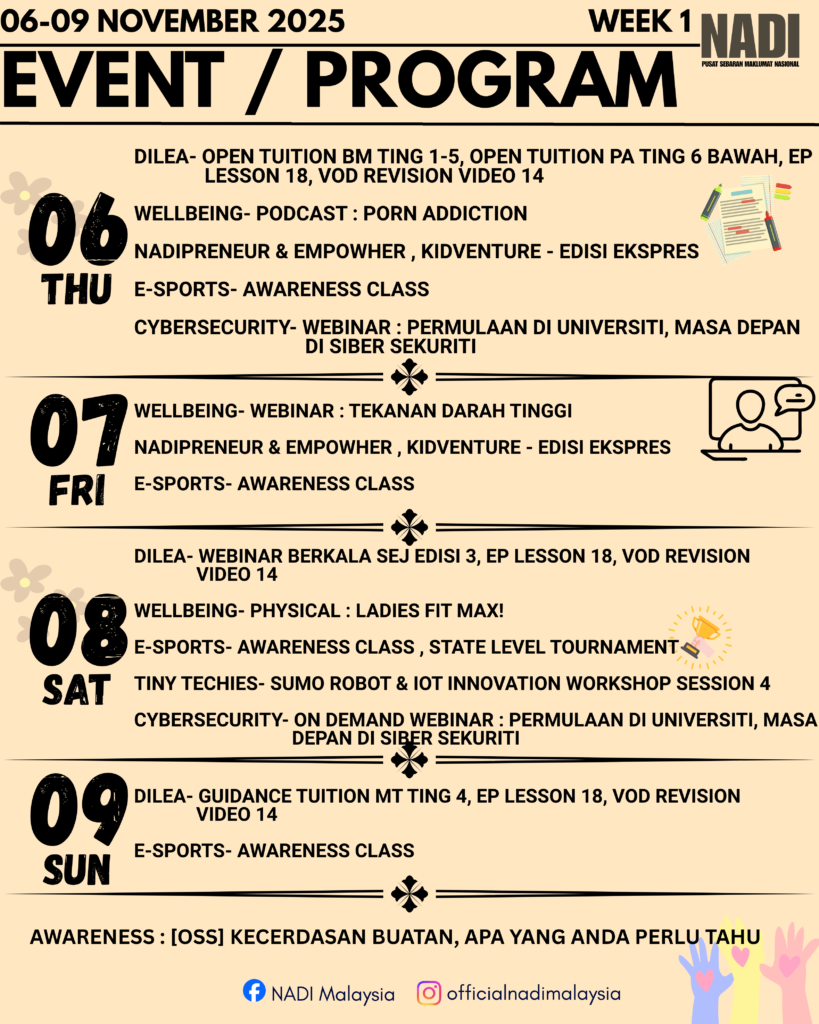 Dimajukan update terkini jadual program Perkhidmatan Pintar (06-09 Nov 2025) di NADI Kg Sungai Leman.