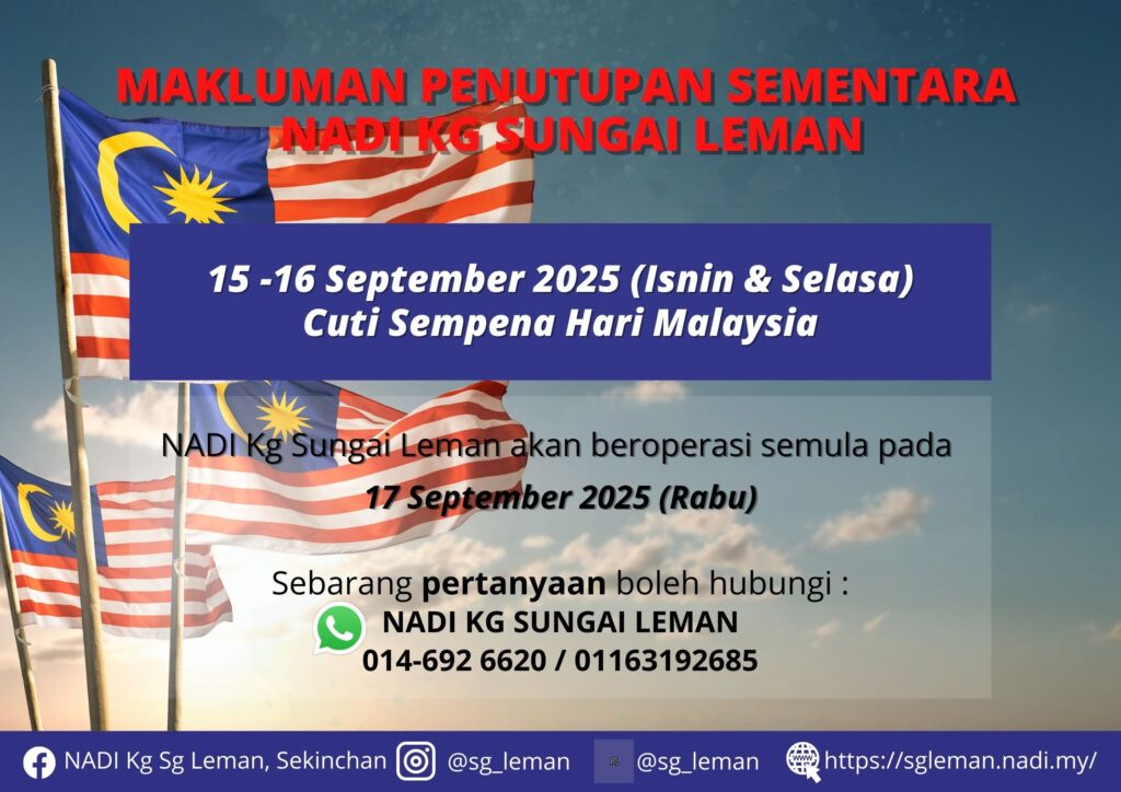 Assalamualaikum, untuk makluman NADI Kg Sungai Leman akan ditutup pada 15 & 16 September 2025 (Isnin & Selasa) sempena Cuti Hari Malaysia