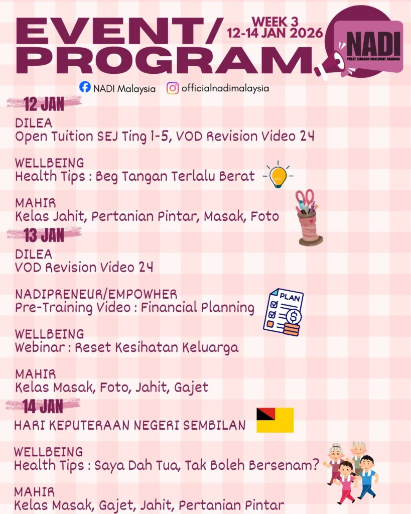 #PerkhidmatanPintarNADI#KomunitiDigital#KelasPercuma#KelasKemahiran#DILEA#MAHIR#Wellbeing#NADIPreneur#Empowher#OpenTuition#KesihatanKeluarga#PerancanganKewangan#MalaysiaDigital