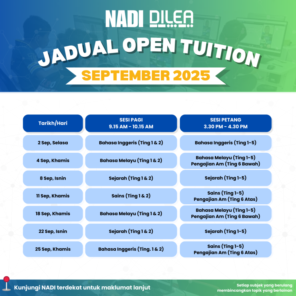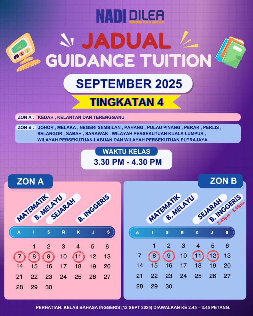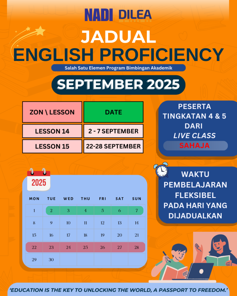 Perhatian: Kelas Bahasa Inggeris pada 12 September 2025 diawalkan ke jam 2:45 petang hingga 3:45 petang.