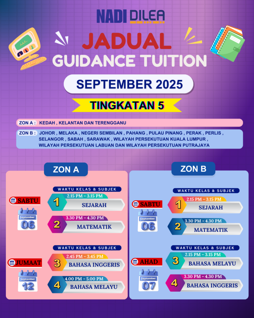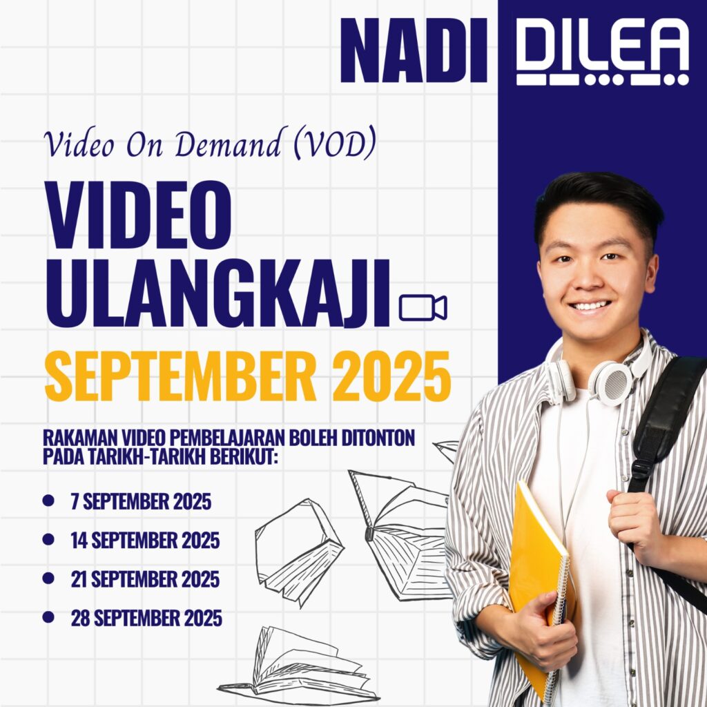 Berikut adalah maklumat terkini mengenai program GUIDANCE TUITION, OPEN TUITION, VIDEO ON DEMAND (VOD) dan ENGLISH PROFICIENCY yang akan dijalankan sepanjang bulan September 2025.