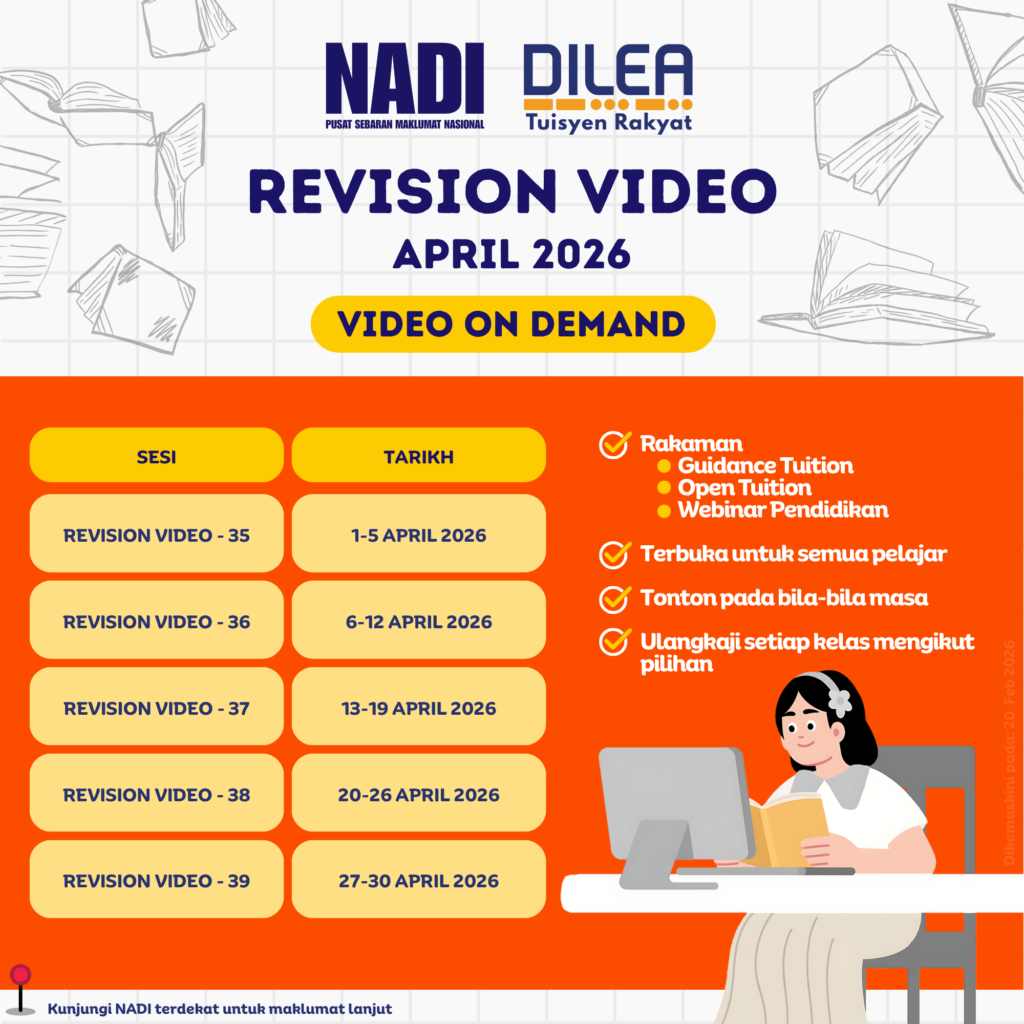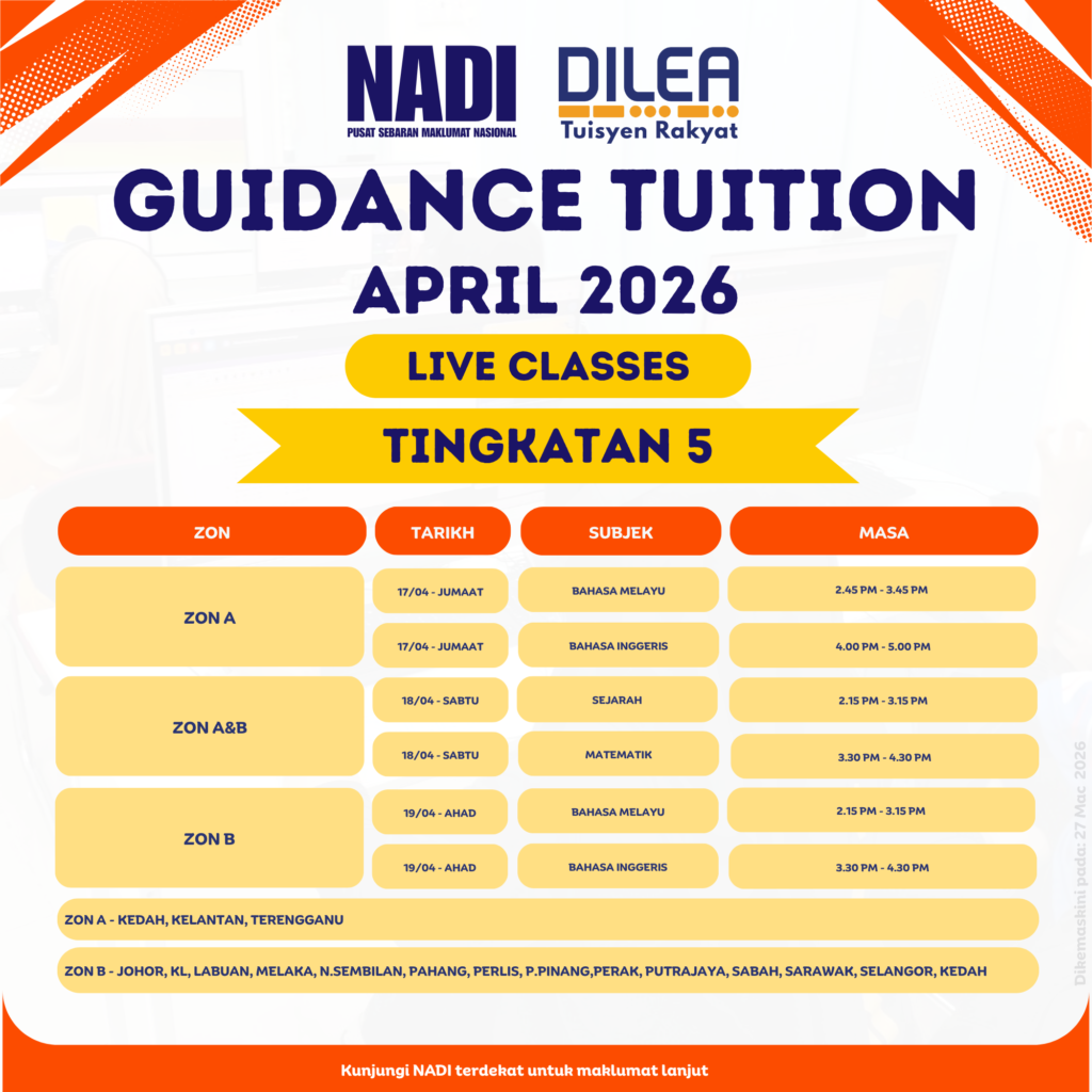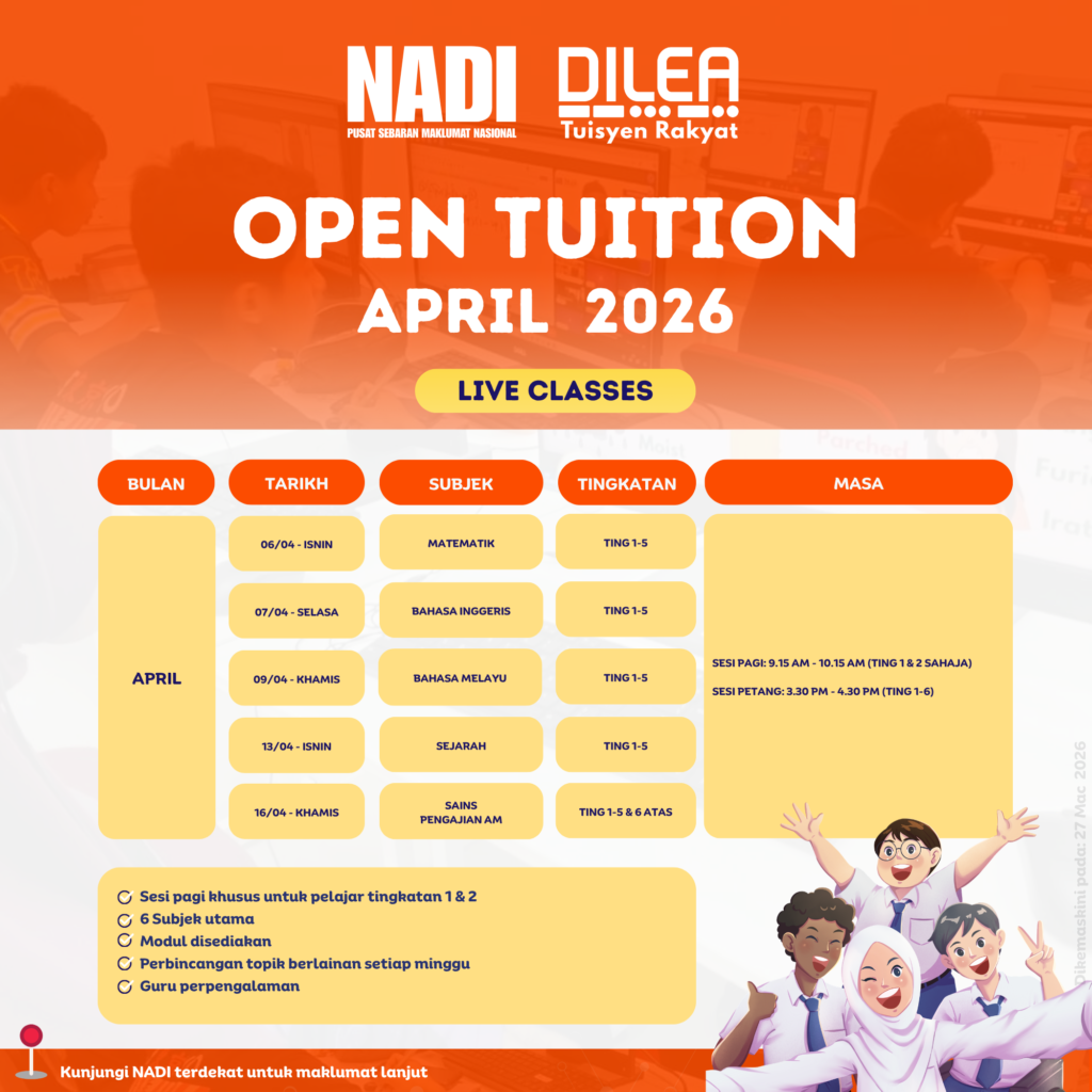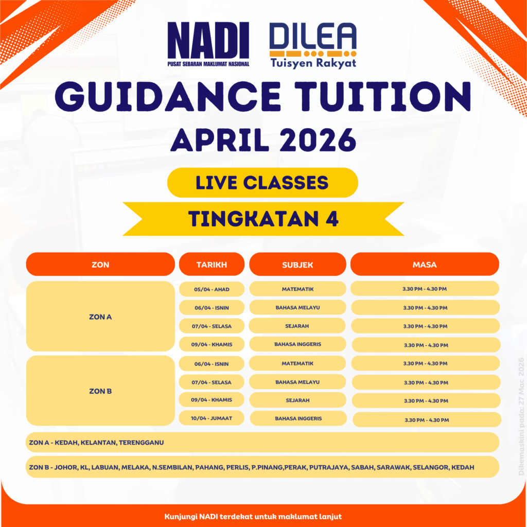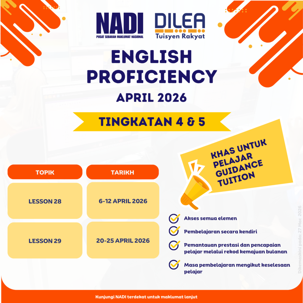 Berikut adalah maklumat terkini mengenai program DILEA Tuisyen Rakyat bagi Guidance Tuition, Open Tuition, Video on Demand (VOD) – Revision Video, dan English Proficiency yang akan dijalankan sepanjang bulan April 2026.