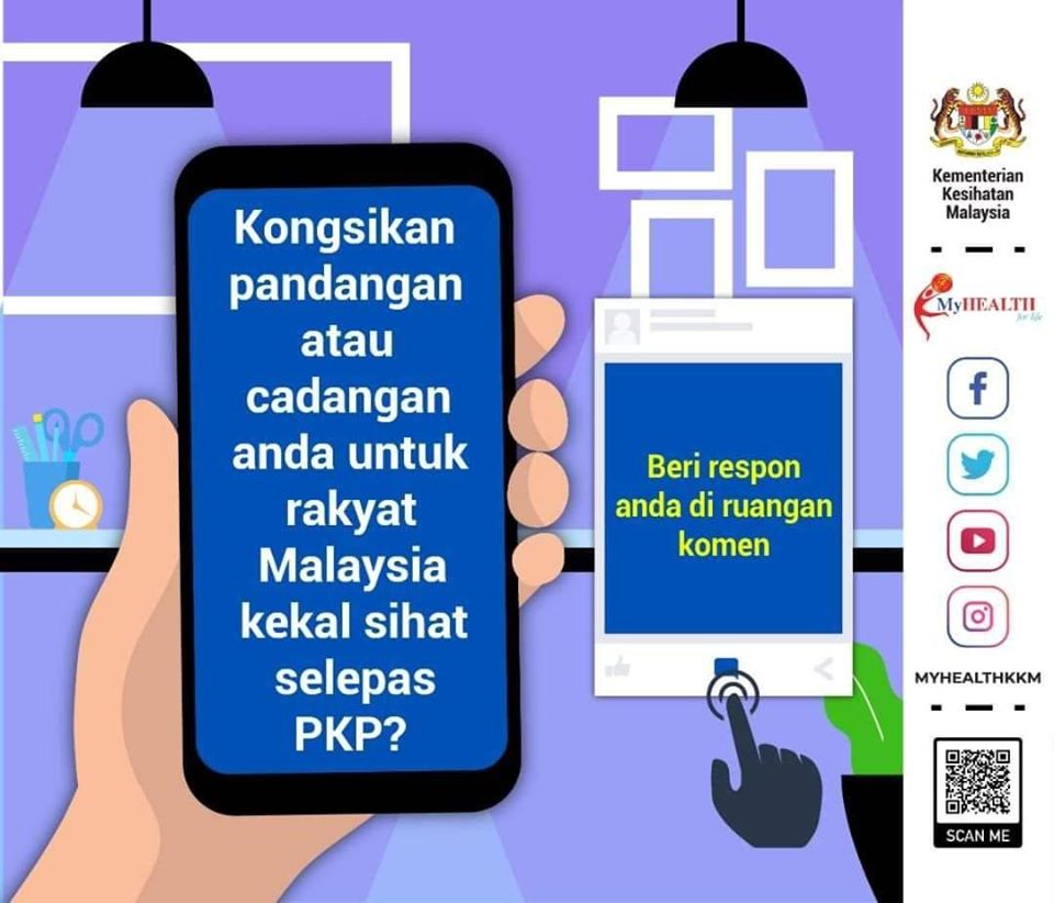 Anda di pelawa untuk memberi cadangan atau pandangan kepada KKM untuk rakyat Malaysia kekal sihat selepas PKP. Cadangan atau pandangan anda boleh diberi melalui pautan https://tinyurl.com/soalrakyatpascaCOVID