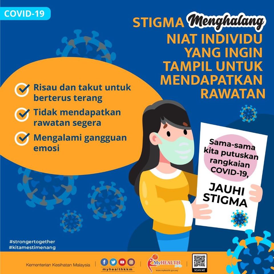 Hentikan stigma/diskriminasi/tanggapan negatif terhadap pesakit yang dijangkiti covid-19. Dapatkan rawatan segera sekiranya anada bergejala. Jangan risau atau takut tanggapan orang lain sekiranya anda dijangkiti. Hapuskan stigma, bersama kita putuskan rantaian jangkitan COVID-19.