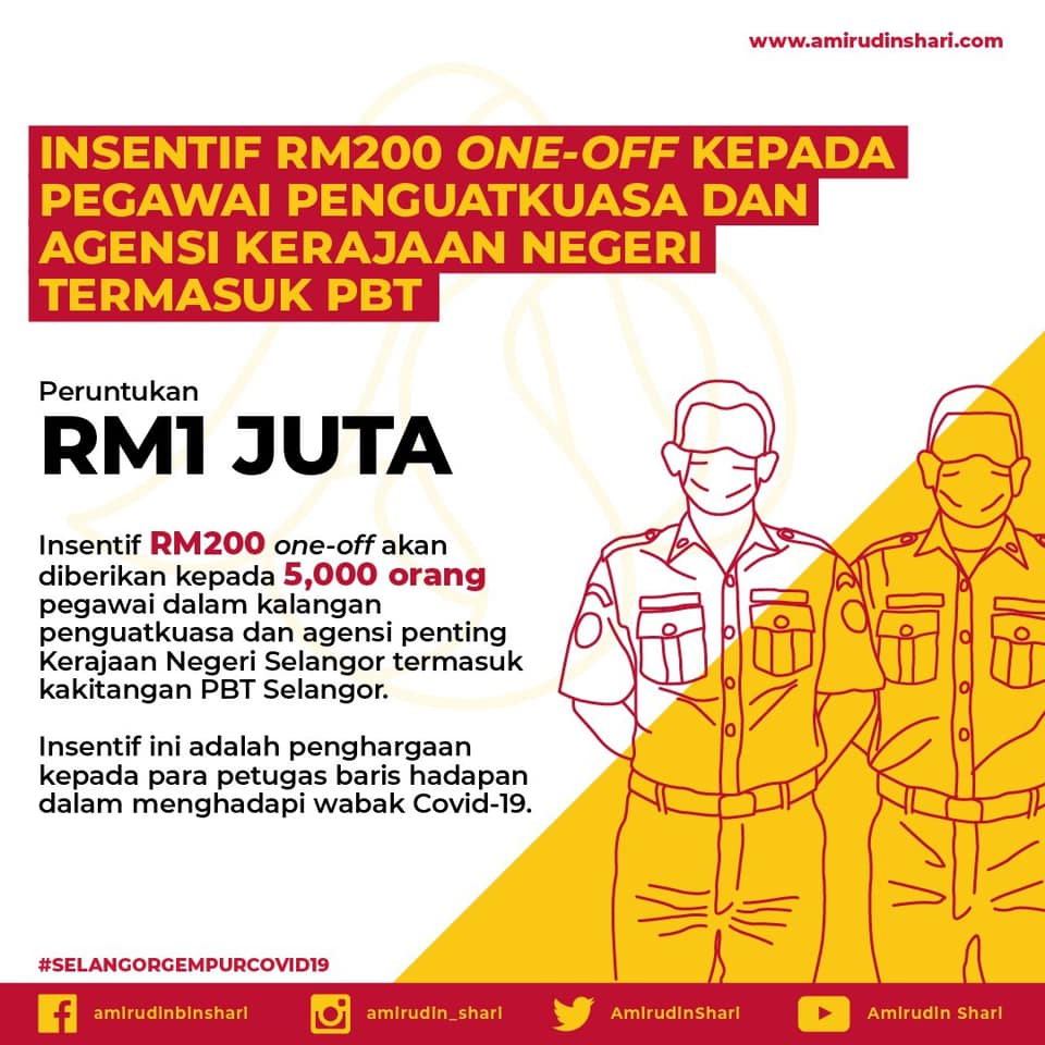 Bagi menghargai pegawai dalam kalangan penguatkuasa dan agensi penting Kerajaan Negeri Selangor termasuk kakitangan PBT Selangor, Kerajaan Negeri telah meluluskan Insentif One Off berjumlah RM 200 seorang kepada 5,000 orang di Selangor. Insentif ini adalah sebagai suatu lagi bentuk penghargaan kepada para petugas barisan hadapan dalam menghadapi wabak Covid-19. Sebanyak RM 1 Juta diperuntukkan untuk keputusan tersebut.