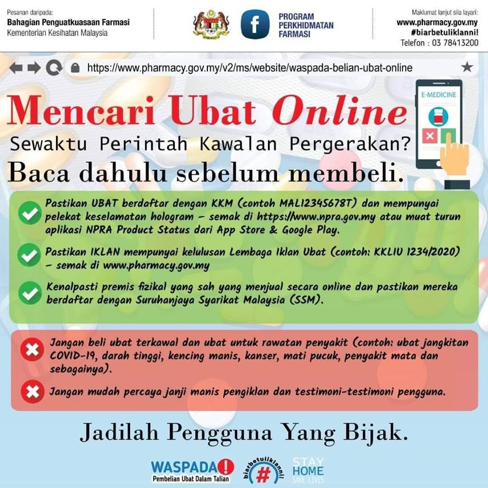 Terima kasih kerana mengikuti saranan KKM untuk kekal berada di rumah sewaktu Perintah Kawalan Pergerakan (PKP). Dalam tempoh PKP, mungkin ramai yang kerap melayari Internet untuk mengetahui situasi terkini berkaitan Covid-19. KKM ingin menasihatkan agar berhati-hati sekiranya anda berhasrat untuk membeli ubat dalam talian. Jom download aplikasi NPRA Product Status dari Google Play atau App Store. Lepas ini, kalau ada penjual berkata produk mereka berdaftar dengan KKM, jangan terus percaya. Semak dahulu sebelum klik. Pastikan Ubat anda mempunyai no. pendaftaran MAL dan pelekat keselamatan hologram dan IKLAN Ubat mempunyai no. KKLIU.