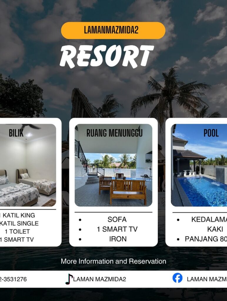 Resort Laman Mazmida 2 terletak di Sungai Limau Sungai Besar ini menawarkan penginapan 4 bilik tidur dengan 6-7 katil queen, 1 katil king, 1 katil single, dan 3 bilik mandi. Ianya sesuai untuk percutian keluarga atau berkumpulan, lengkap dengan kemudahan BBQ dan aktiviti berbasikal.